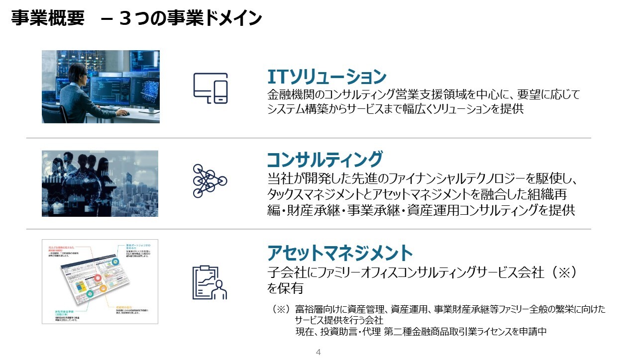 塩谷:ここからは、成長戦略のうち、3つ目の「ファミリーオフィスビジネスへの参入」についてご説明いただきます。従来のシステム開発会社を中心としたモデルとは少し異なる印象を受けますが、もう少し詳しく教えていただけますか?