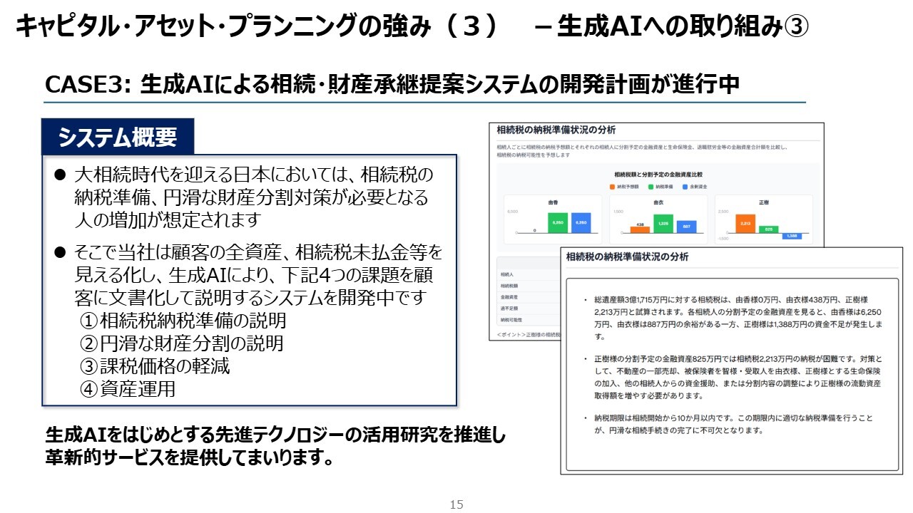 北山:生成AIを活用して相続・財産承継の提案書を作成するシステムの開発も進行中で、今年4月頃には提供できる予定です。