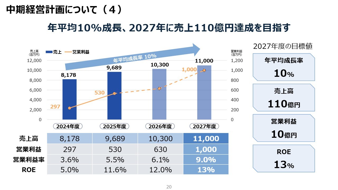 2025年から始まった中期経営計画では、最終年度の2027年9月期に、ROE13パーセントおよび営業利益10億円の達成を目標としています。