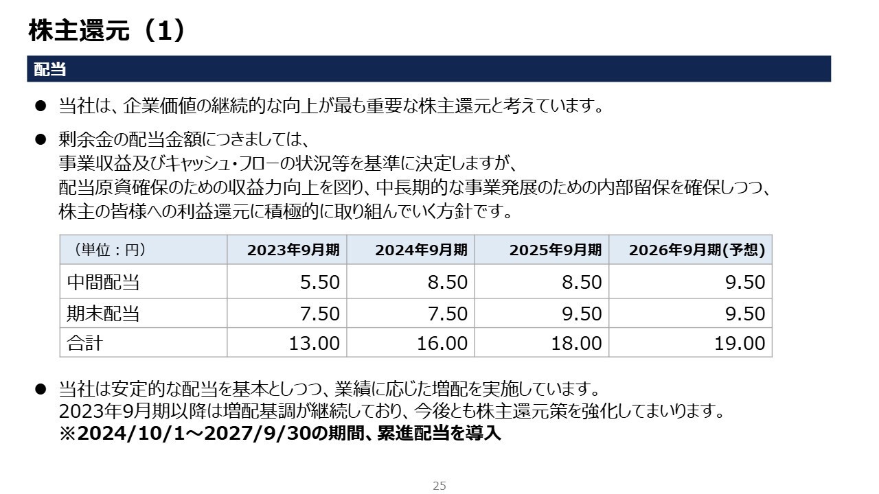 まず、配当についてです。2025年9月期においては、中間配当と期末配当を合わせて1株当たり18円の配当を実施しました。2026年9月期については、中間配当9.5円、期末配当9.5円で、合計19円を予想しています。
