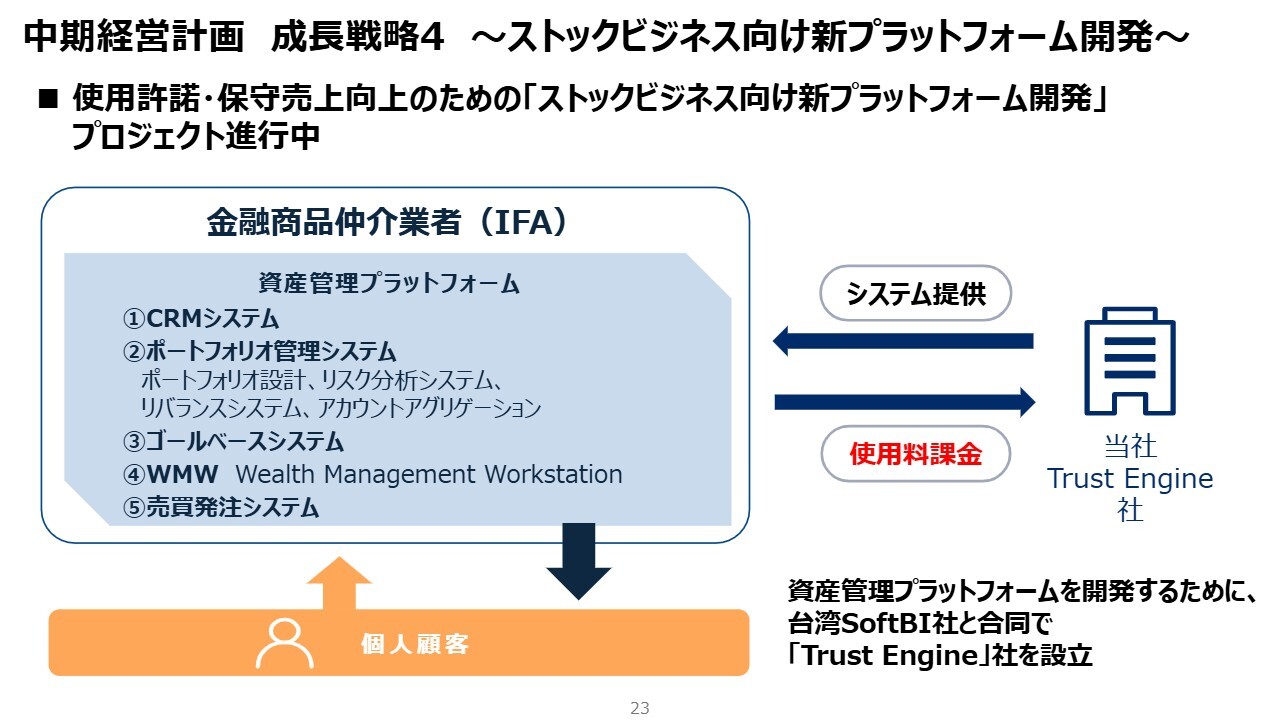 先ほどご説明した台湾のSoftBI社と当社が設立したTrust Engine社が、日本のファミリーオフィスビジネスのためのプラットフォームを構築し、Wealth Engine社、およびその他の会計事務所やIFAがそのシステムを利用します。