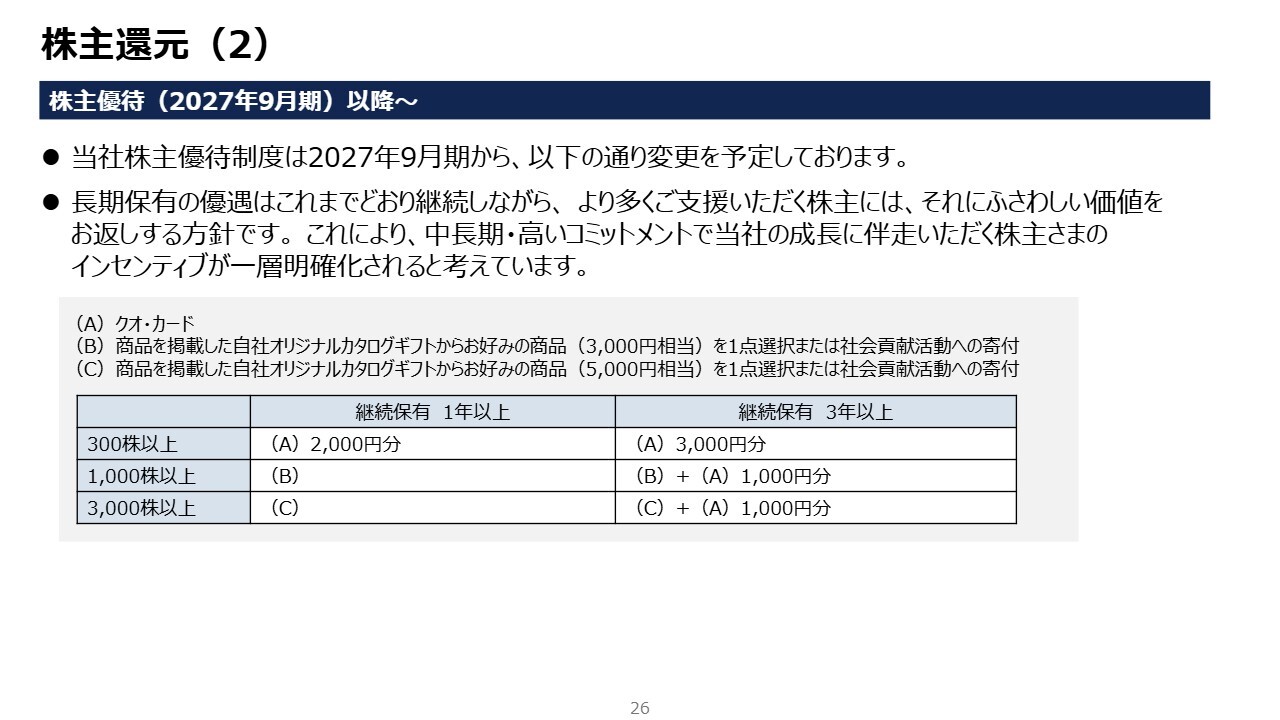 北山:株主優待については、300株以上を1年以上保有いただいている株主さまに、2,000円分の「QUOカード」を支給します。さらに、300株以上を3年以上継続して保有いただいた株主さまには、3,000円分の「QUOカード」を支給します。また、1,000株以上を1年以上保有いただいている株主さまには、3,000円相当のオリジナルカタログギフトを支給しています。保有期間が3年以上の場合には、3,000円相当のオリジナルカタログギフトと1,000円分の「QUOカード」を支給します。