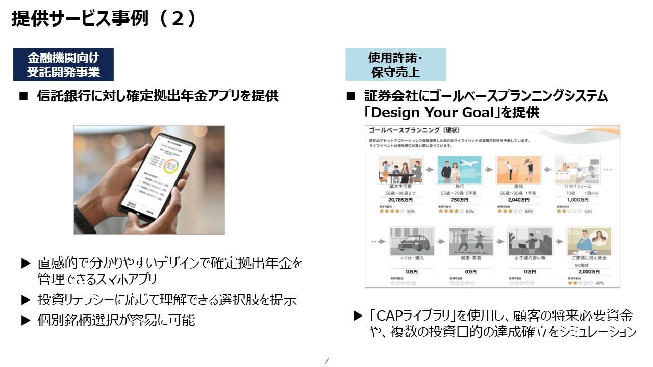スライドには「ゴールベースプランニングシステム」と記載していますが、いわゆるライフプランのシステムや、確定拠出年金アプリを提供するとともに、現在は金融商品仲介業者(IFA)向けの資産管理プラットフォームを開発中です。