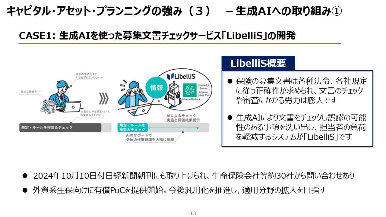 北山:現在注目されている生成AIへの取り組みについてです。当社では、「LibelliS」という生命保険会社の募集文書をチェックするシステムを、生成AIを活用して開発しています。
