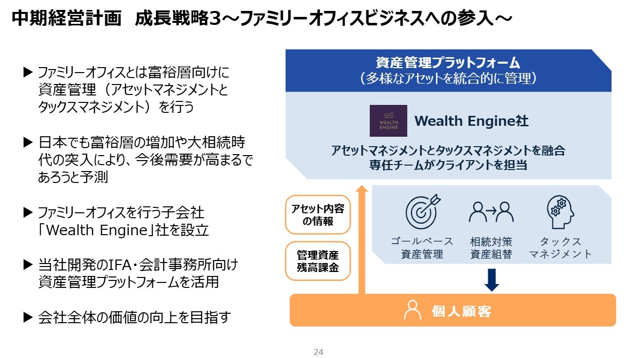 3つ目は、ファミリーオフィスビジネスへの参入です。ファミリーオフィスビジネスは財産承継、事業承継、資産運用を担うもので、日本の人口構成上の課題を解決する役割があります。この分野には、100パーセント子会社Wealth Engine社を通じて参入を進めています。