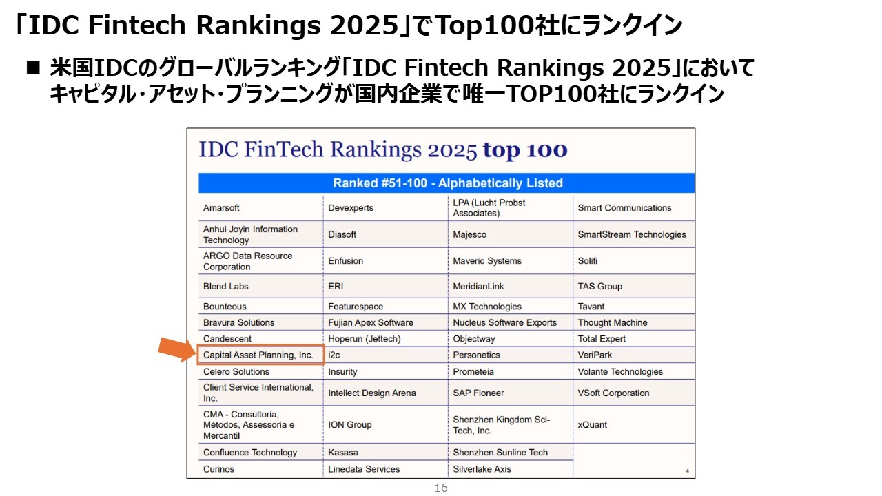 北山:毎年発表される世界のFintech企業ランキングにおいて、当社は昨年「IDC FinTech Rankings 2025 TOP 100」の50位から100位にランクインしました。これは国内では唯一の企業です。