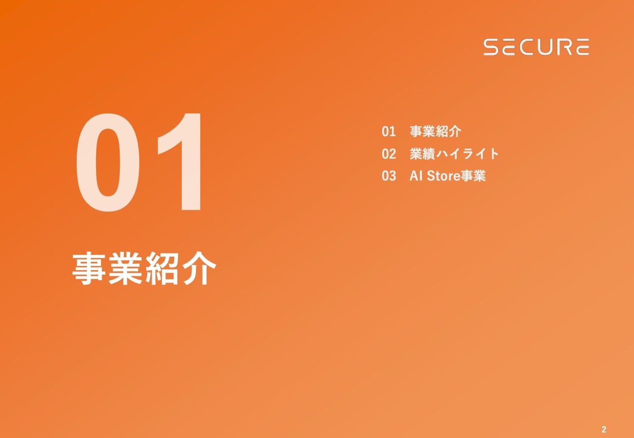 本日は、3つの大きなテーマについてお話しします。当社が初めてという方もいらっしゃると思いますので、まず事業紹介と業績についてお話しします。続いて、先日2月20日にTOUCH TO GOという会社をM&Aしたことをリリースしましたので、それに伴うAI Store事業についてご説明します。