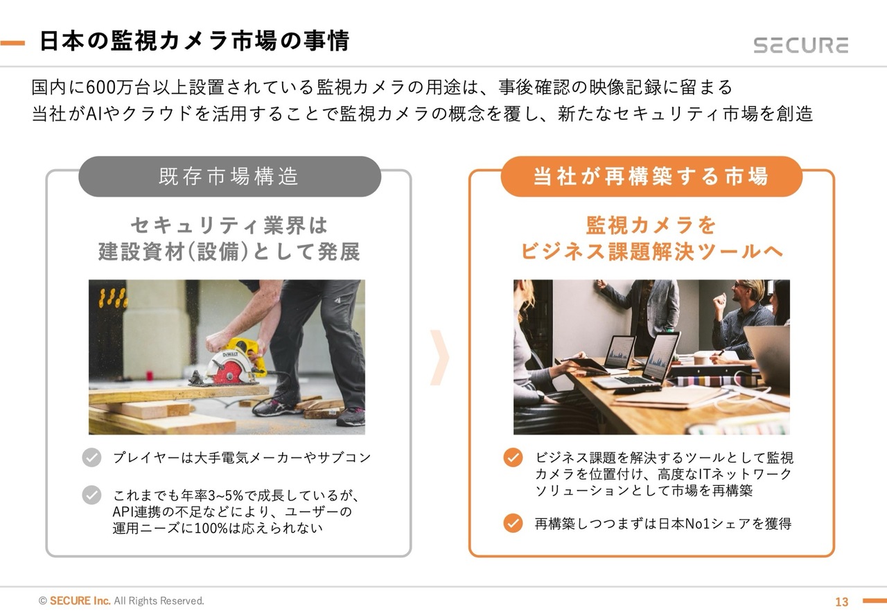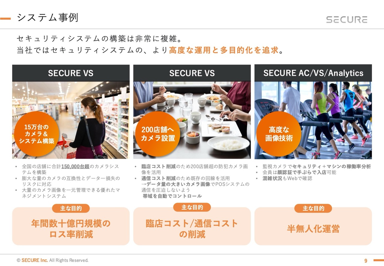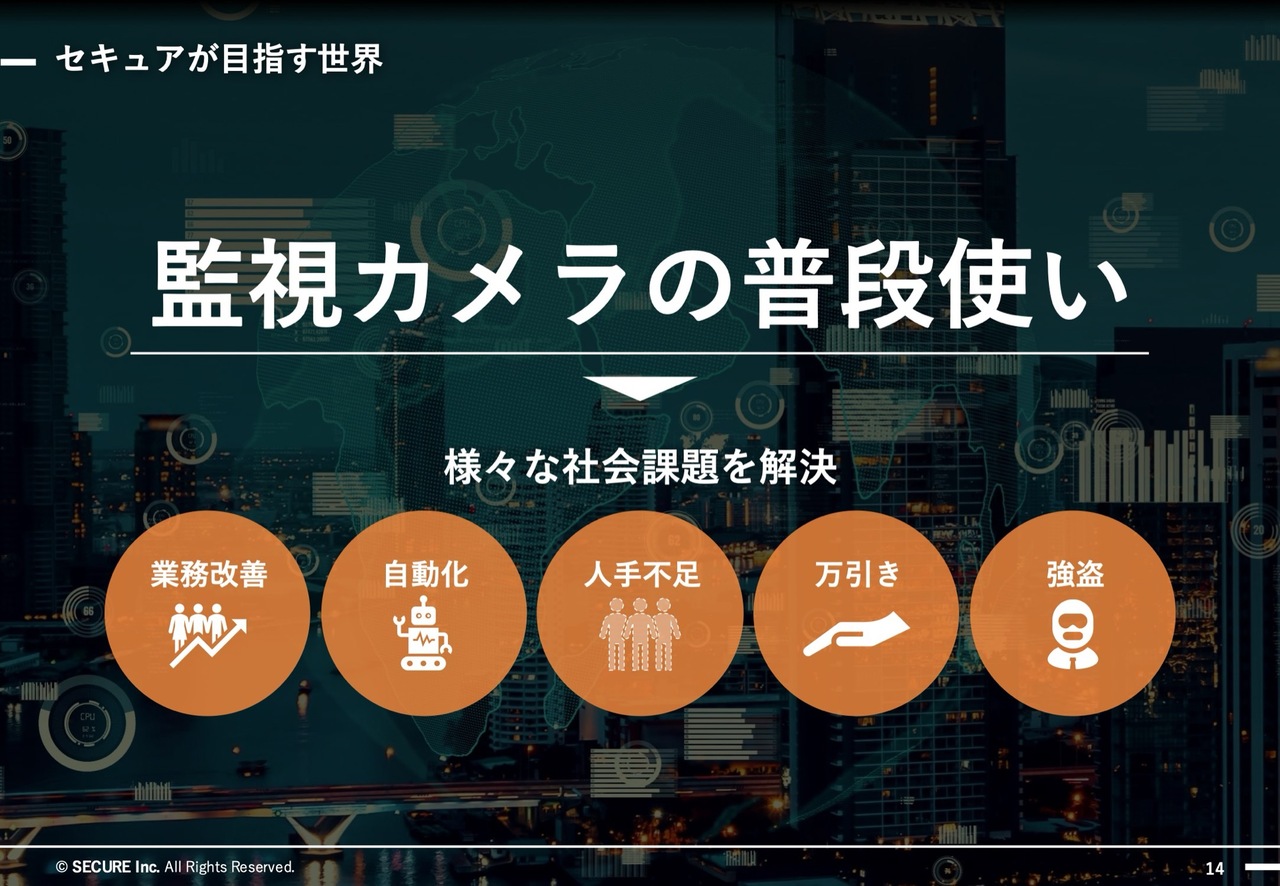 関本圭吾氏(以下、関本):事業概要について、いくつか質問します。まず基本的なところですが、監視カメラによるセキュリティシステムの構築という点について、具体的なイメージがつきにくい部分があります。