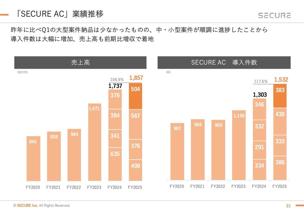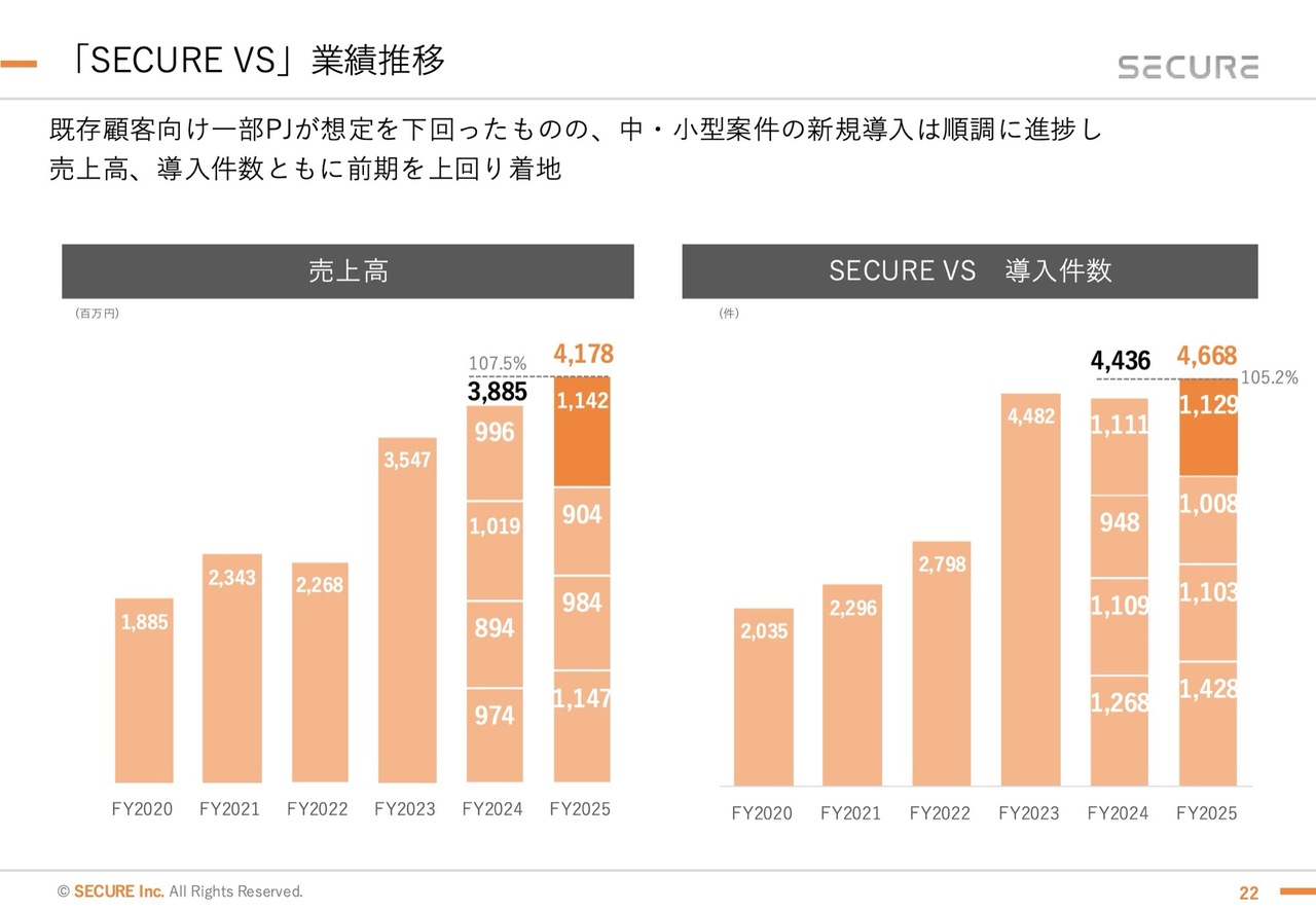 昨年度は「SECURE AC」「SECURE VS」ともに大型案件があまりない中で、中・小型案件を着実に積み上げて成長させることができました。当社としては非常にポジティブに捉えており、伸び率としては若干弱いものの、地力を着実に向上させることができたと考えています。