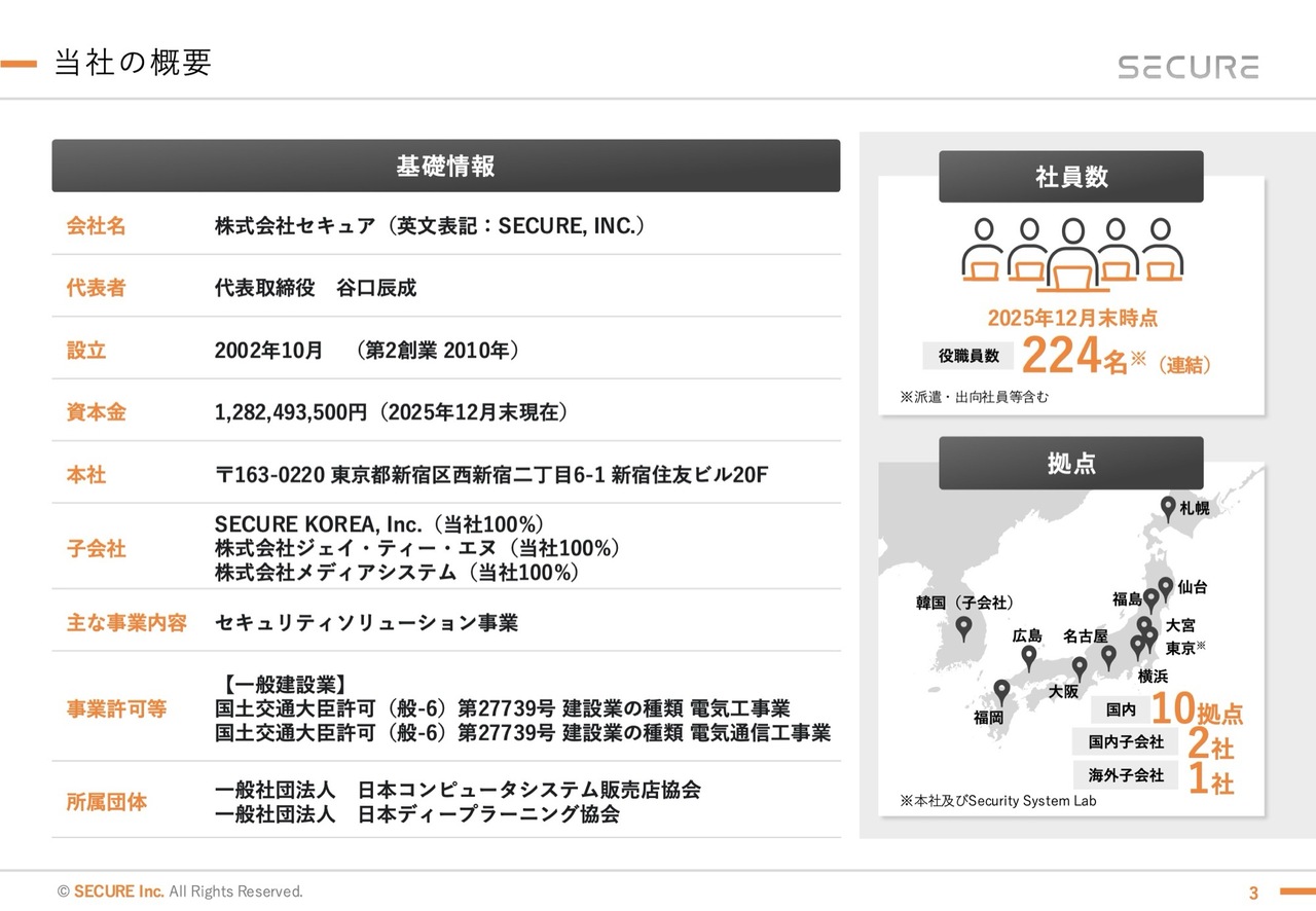 谷口:最初に、当社の概要をご説明します。設立は2002年で、連結従業員数は2025年12月末時点で224名です。
