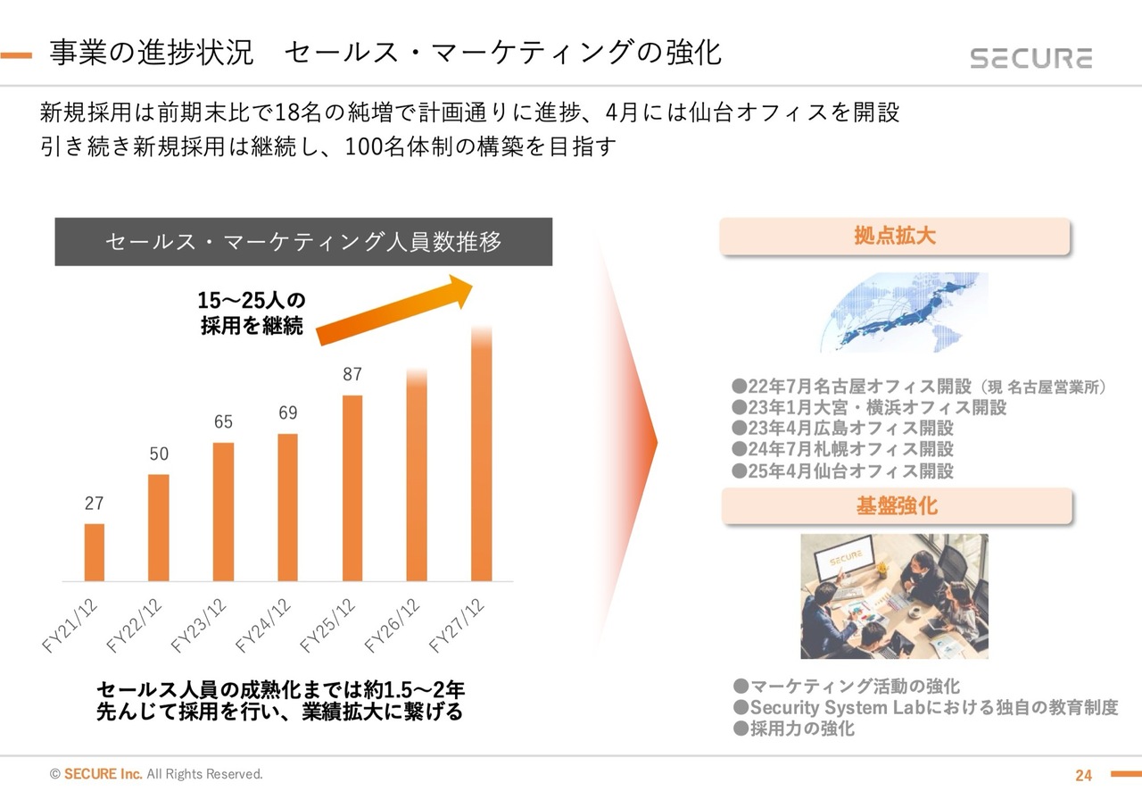 当社ではセールス・マーケティングの人員を100名体制に増やす計画を進めており、今年中に100名を超える見通しです。この数年、増員を1つの指標として取り組んでいます。