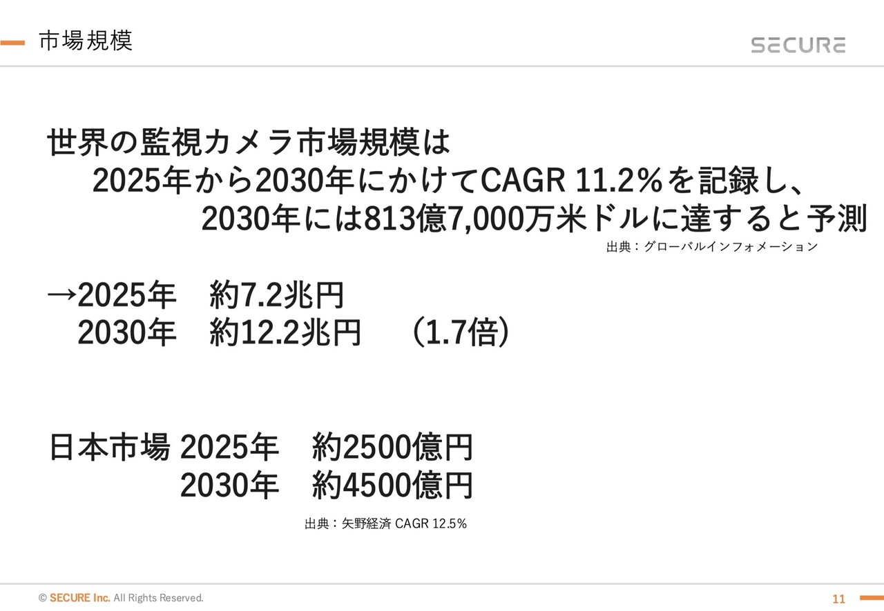 日本国内についても、昨年度は監視カメラ市場だけで約2,500億円といわれており、5年後には4,500億円規模のマーケットになると予測されています。このように、市場環境としては非常にニーズが増加している状況です。