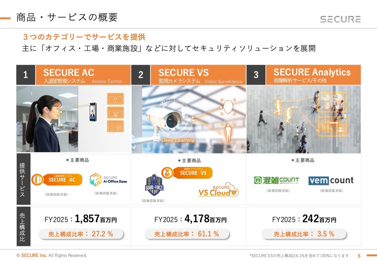 谷口:商品・サービスの概要を説明します。まず、売上の27.2パーセントを占める入退室管理システムです。最近では顔認証を活用した入退室管理システムを、オフィスや店舗のバックヤード、工場などに導入しています。