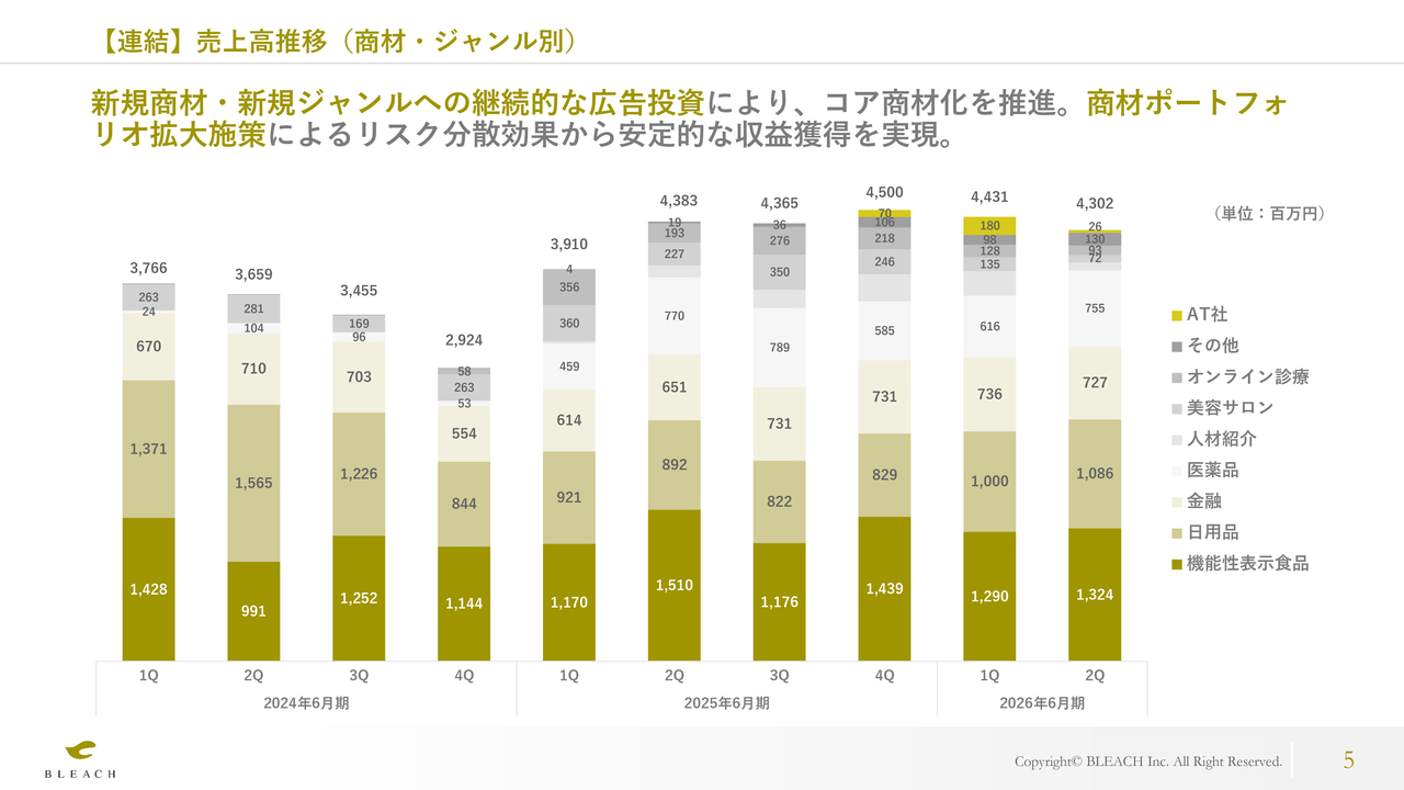 また、本体のブリーチ社の売上高は2,000万円増加し、機能性表示食品や医薬品の売上高も伸びています。一方で、美容サロンや人材紹介ジャンルでは減少が見られました。
