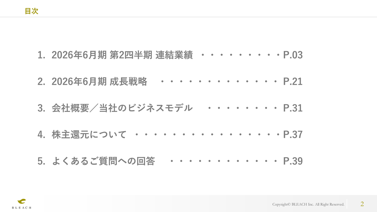 大平啓介氏:本日は、株式会社ブリーチの2026年6月期第2四半期決算説明会にご参加いただき、誠にありがとうございます。代表取締役社長の大平です。本日は、目次に沿ってご説明を進めます。