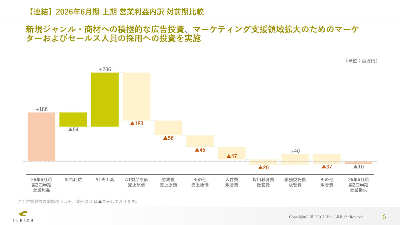 広告利益が5,400万円減少したことに加えて、2026年6月にサービス提供を開始したオーラムテック社における美容機器販売の拡大に伴い、売上総利益が2,300万円増加しました。