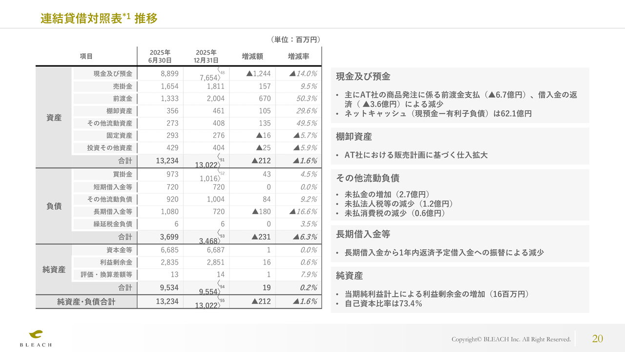 連結貸借対照表の推移です。現金および預金は、長期借入金の返済により3億6,000万円減少したことに加え、オーラムテック社の商品の発注にかかる前渡金により6億7,000万円支出したこことで、12億4,400万円減少しました。