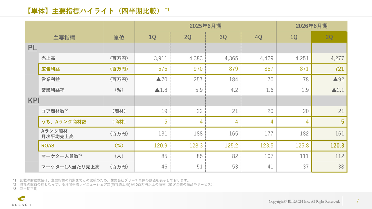 単体の主要なKPIである広告利益、ROASの四半期推移です。広告利益は、当第1四半期の8億7,000万円から7億2,000万円に減少しています。これは新規素材や新規ジャンルへの広告投資の影響が大きいことによるものです。