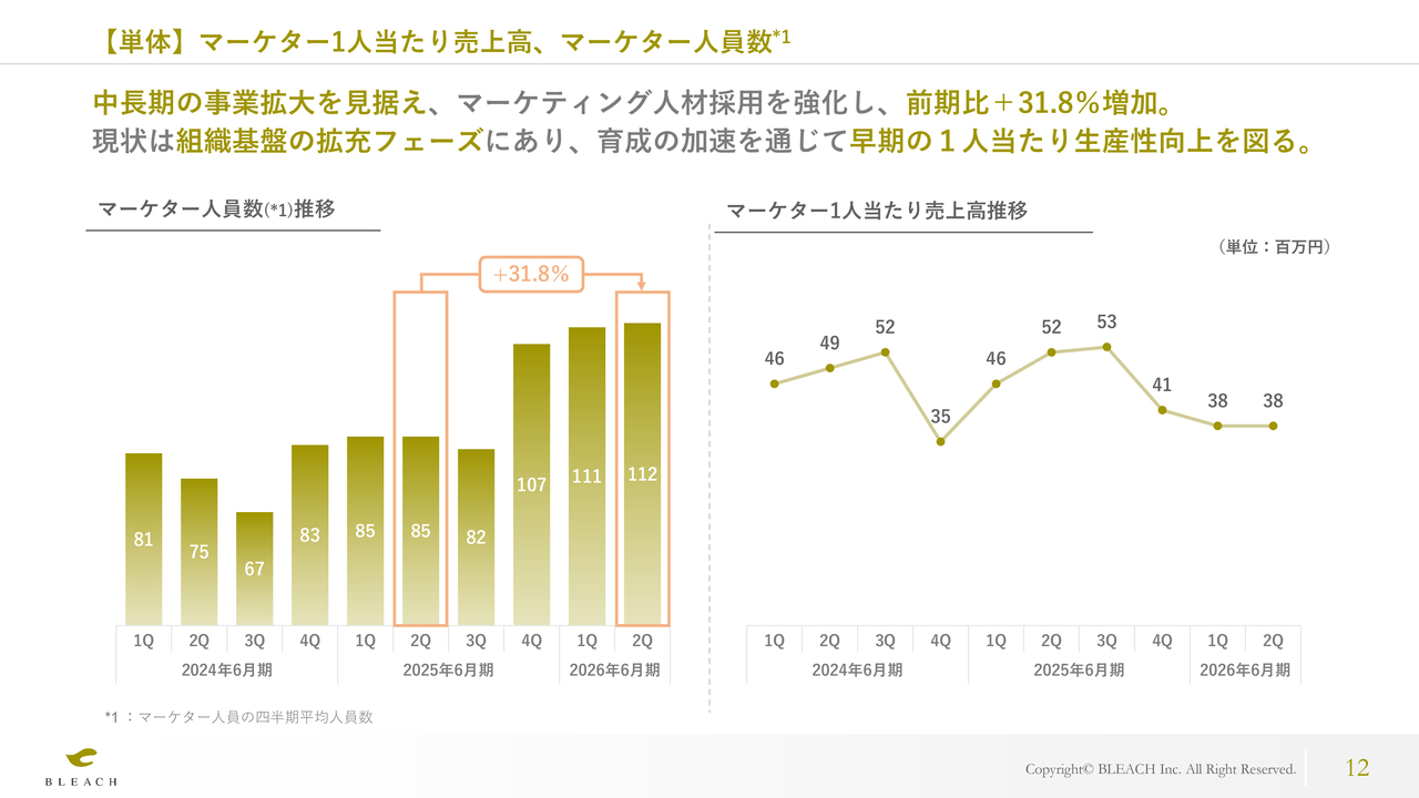 単体の主要なKPIであるマーケター1人当たりの売上高および人員数の推移です。2025年4月に新卒社員26名が入社し、平均マーケター人数は112名に増加しました。