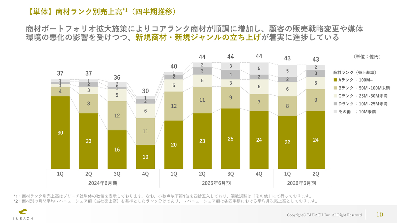 単体の主要なKPIである商材のランク別売上高の四半期推移です。Aランクの商材数が5商材に増加し、Aランクの売上高は24億円となりました。しかし、コア商材化に時間を要している部分もあり、まだ大きく成長できているとは言えない状況です。