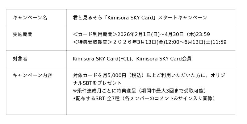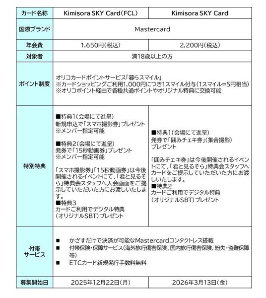 また、既に発行しているFCL(フルカードレスタイプ)クレジットカードの「Kimisora SKY Card(FCL)」に加え、プラスチックカード「Kimisora SKY Card」を3月13日から発行を開始いたします。