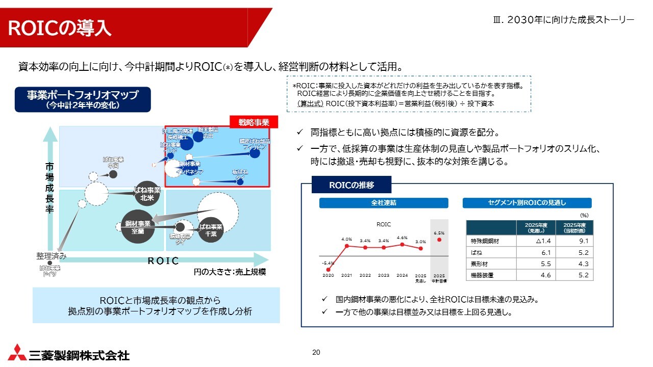 このような事業ポートフォリオの転換を進めるため、今中期経営計画よりROIC経営を導入しています。ROICは、事業に投入した資本がどれだけ利益を生み出しているかを表す指標であり、中長期的な企業価値向上を目指す上で有効な指標だと考えています。