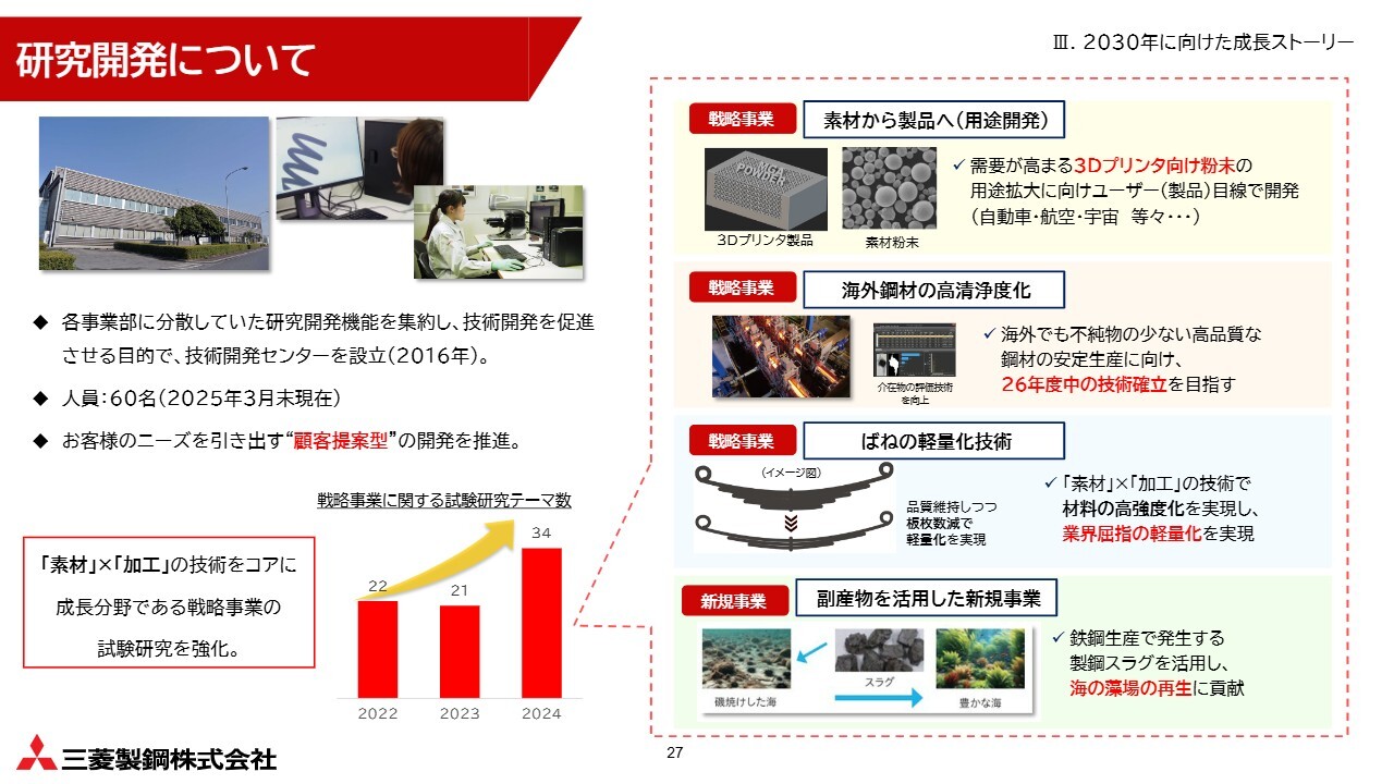 3つ目は、新分野への拡販です。中長期的な国内市場の縮小を見据え、成長分野の鋼種開発を推進しています。