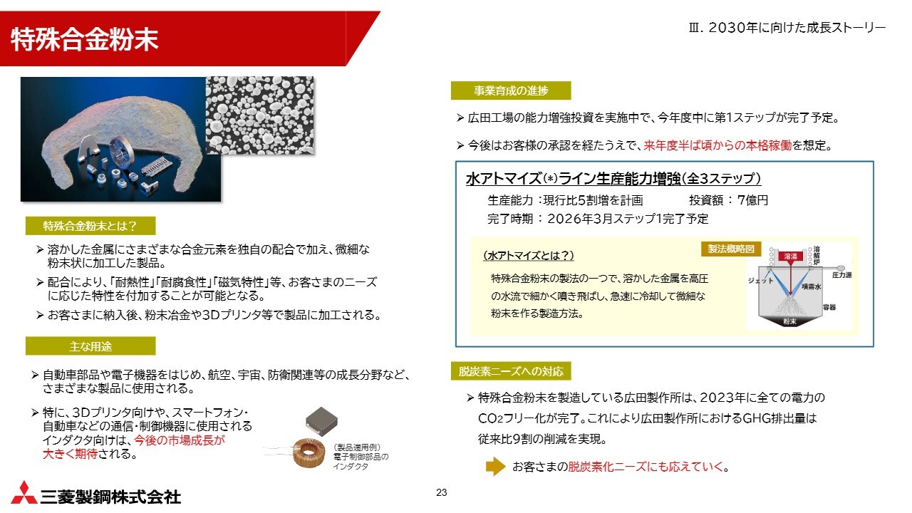 従来は、自動車内燃機関向け部品が事業の中心でしたが、自動車の電動化に伴い将来的な需要減が想定されるため、市場の拡大が見込まれる特殊合金粉末を戦略事業に掲げ、育成を進めています。詳しくは後ほどご説明します。