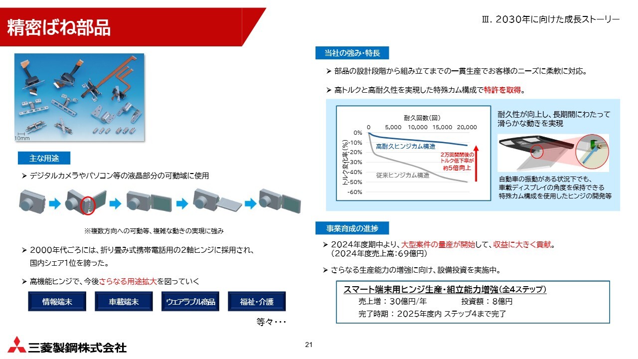 今後、成長が期待される分野として、商用車用の板ばねや車両用のばね、精密ばね部品などが挙げられます。
