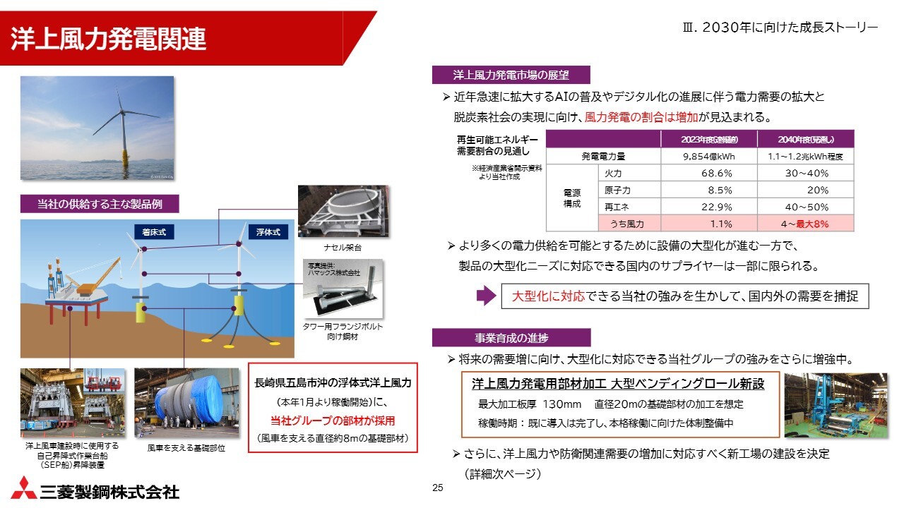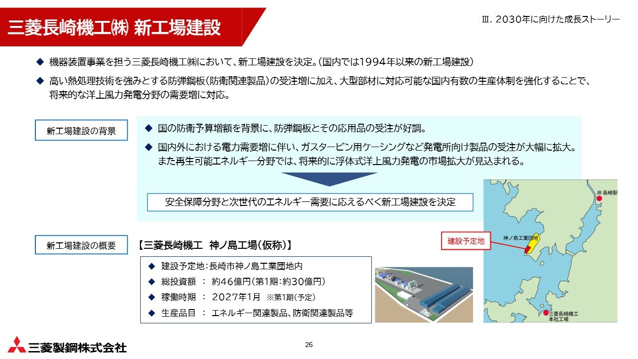そのため、先ほど申し上げた新工場についても、将来の洋上風力の需要増に備えて、来年1月の稼働開始を予定しています。まずは防衛関連製品から立ち上げになる可能性がありますが、その先で洋上風力発電関連製品も本格的に手がけていく計画です。着実に準備を進めていきます。