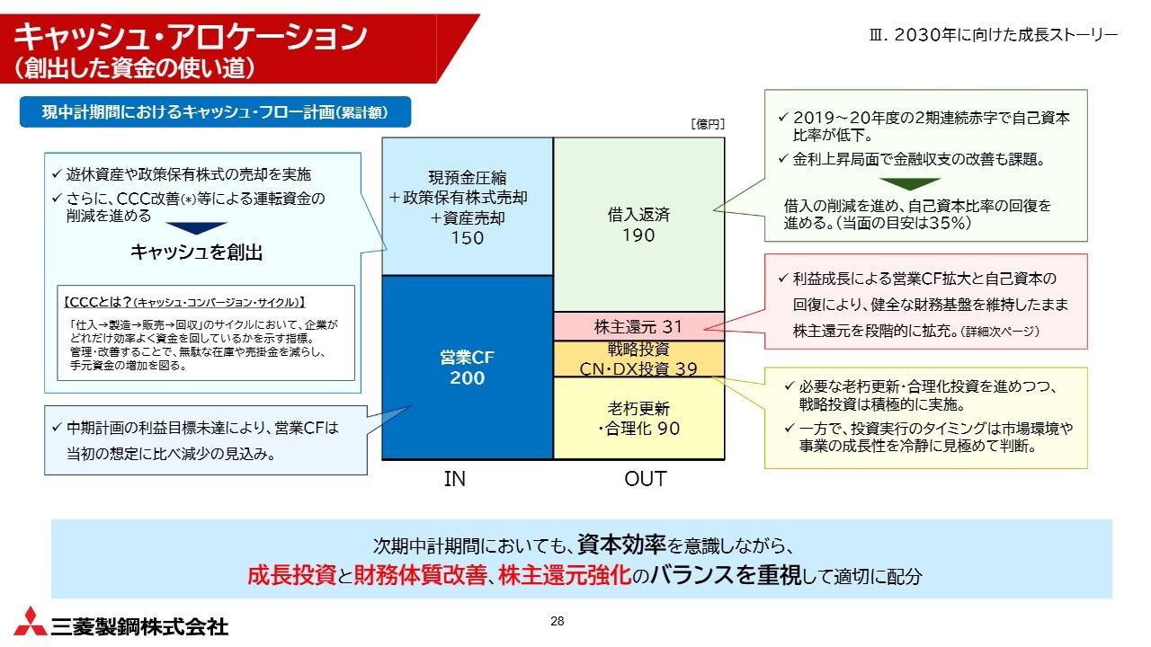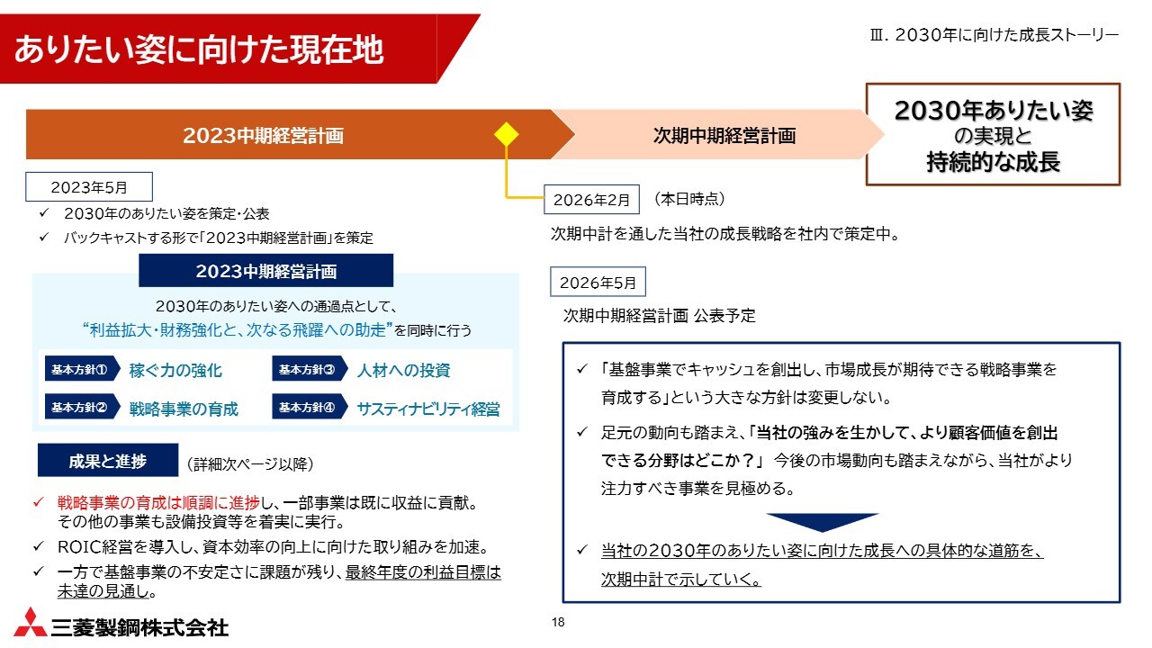このような中で、現在、2026年5月の公表に向けた次期中期経営計画の策定を進めています。「基盤事業でキャッシュを創出し、市場成長が期待できる戦略事業を育成する」という大きな方針に変更はありません。