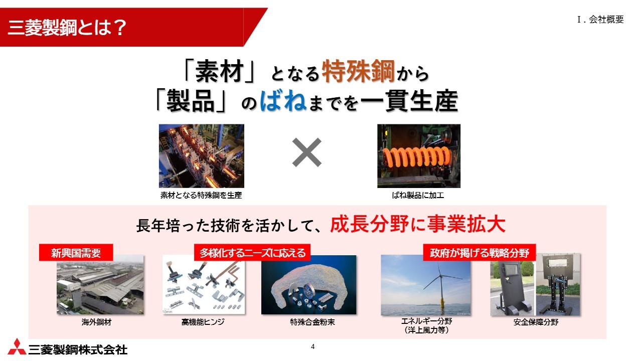 三菱製鋼がどのような会社なのか、簡単にご説明します。社名のとおり「製鋼」、すなわち特殊鋼と呼ばれる「鋼」を製造する会社です。当社の大きな特長は、その素材を自社で加工し、製品である「ばね」まで一貫生産できる点にあります。