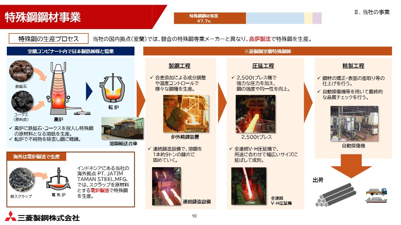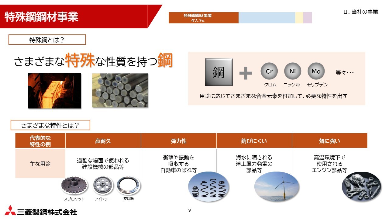 まず、売上高全体のおよそ半分を占める特殊鋼鋼材事業についてご説明します。特殊鋼とは、一般的な鋼とは異なり、用途に応じて合金元素を付加することで、さまざまな特殊な性質を持たせた鋼のことを指します。