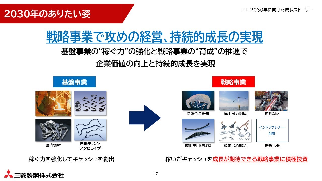 当社は、「2030年のありたい姿」として、国内鋼材や自動車用ばねといった基盤事業の稼ぐ力を強化してキャッシュを創出しつつ、戦略事業として掲げた5つの事業と新規事業へ積極的に投資することで、持続的成長を目指していきます。