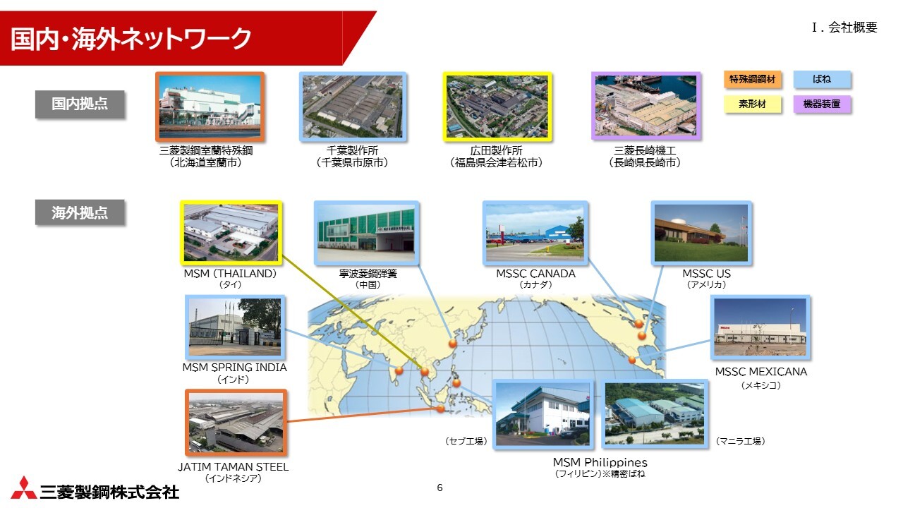 スライドには当社の主要な生産拠点を示しています。国内では北海道室蘭市、千葉県市原市、福島県会津若松市、長崎県長崎市の4拠点があり、海外では北米やアジア地域を中心にグローバルに展開しています。