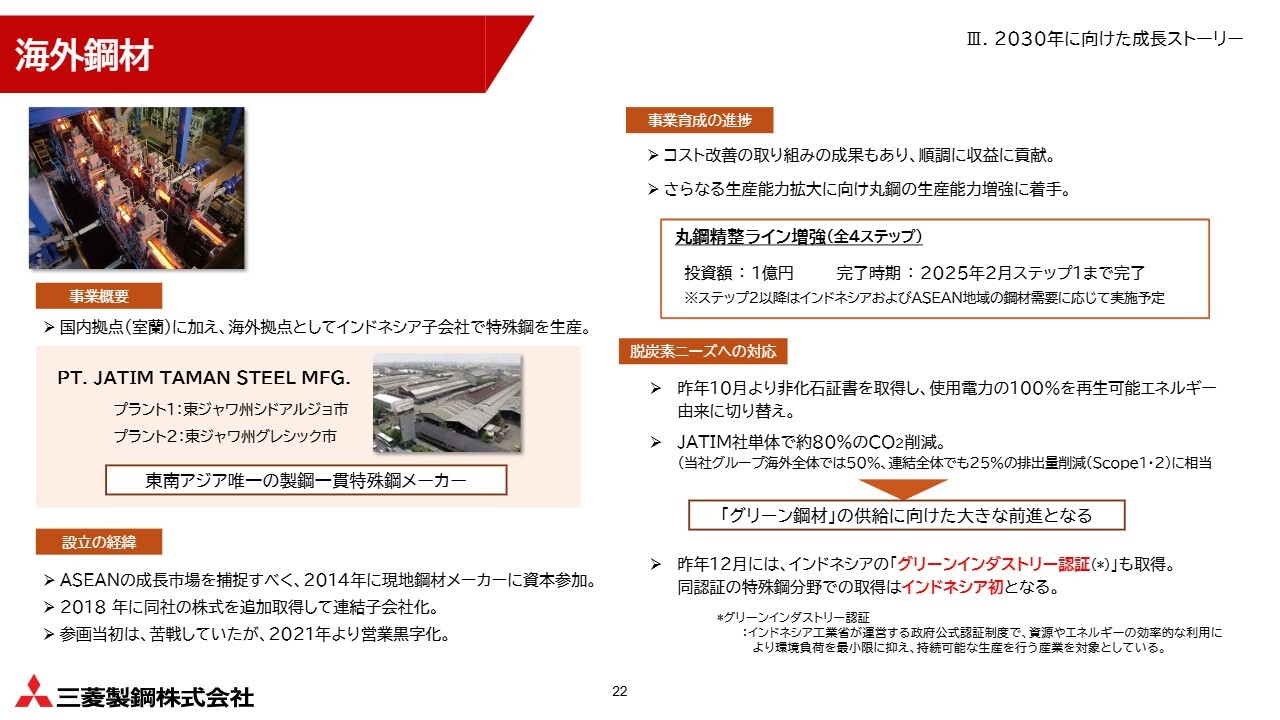 海外鋼材事業についてです。こちらも足元で順調に収益に寄与しています。インドネシアのJATIM社では、東南アジア唯一の製鋼一貫特殊鋼メーカーとして、ASEANの成長市場の需要を捕捉すべく、事業強化を進めています。