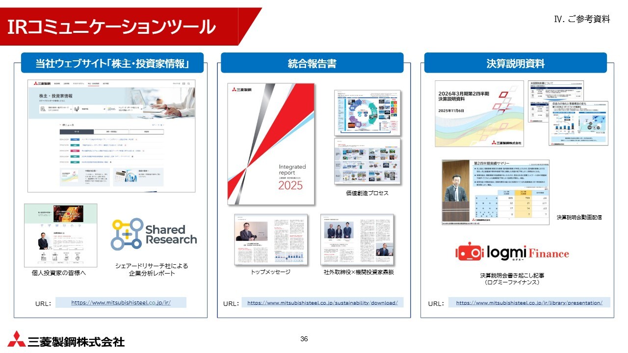 参考資料についてご案内します。当社では、Webサイト、統合報告書、決算説明資料など、さまざまなかたちで株主、投資家のみなさまに向けた情報発信を行っています。本日お話しした内容をより詳しく掲載していますので、ぜひご覧ください。