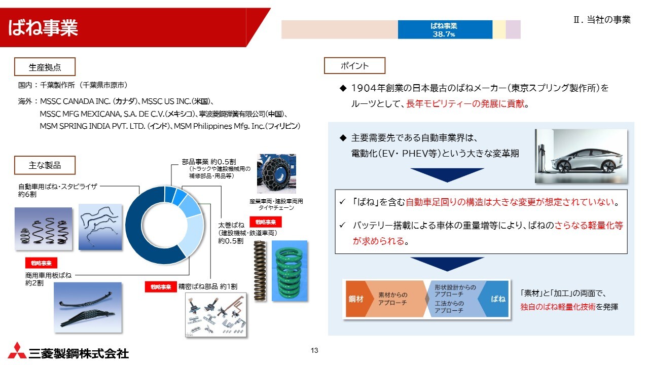 ばね事業の概要です。製品の構成比率では、自動車用が半分以上を占めています。向け先としては、トヨタ自動車をはじめとする日系自動車メーカーに幅広く納入しているほか、北米拠点ではGeneral Motors(GM)をはじめ、アメリカの現地自動車メーカー向けにも納入しています。