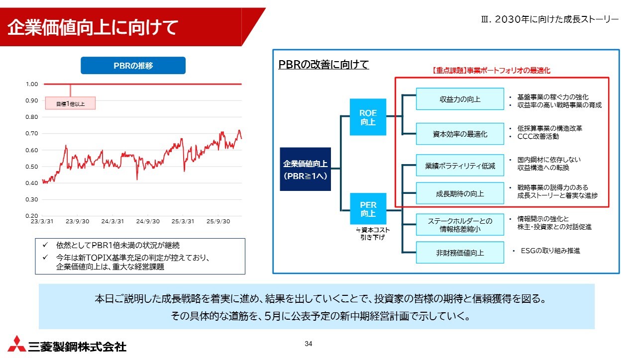 そのためには、当社の成長ストーリーをもっと具体的にお示しすることが不可欠だと反省しています。2026年5月に公表予定の資料で、戦略や収益計画を分かりやすく記載し、みなさまに丁寧にご説明していきます。それによって将来への期待を持って株式を保有・購入いただけるよう、取り組みを加速していきます。