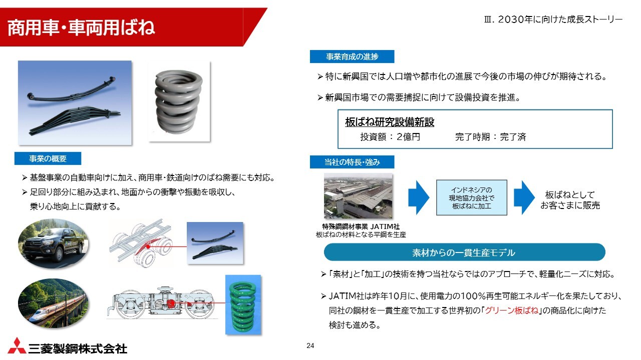 先ほどご説明したJATIM社でグリーン鋼材の生産を開始できれば、それを加工した世界初の「グリーン板ばね」の供給も視野に入ってきます。