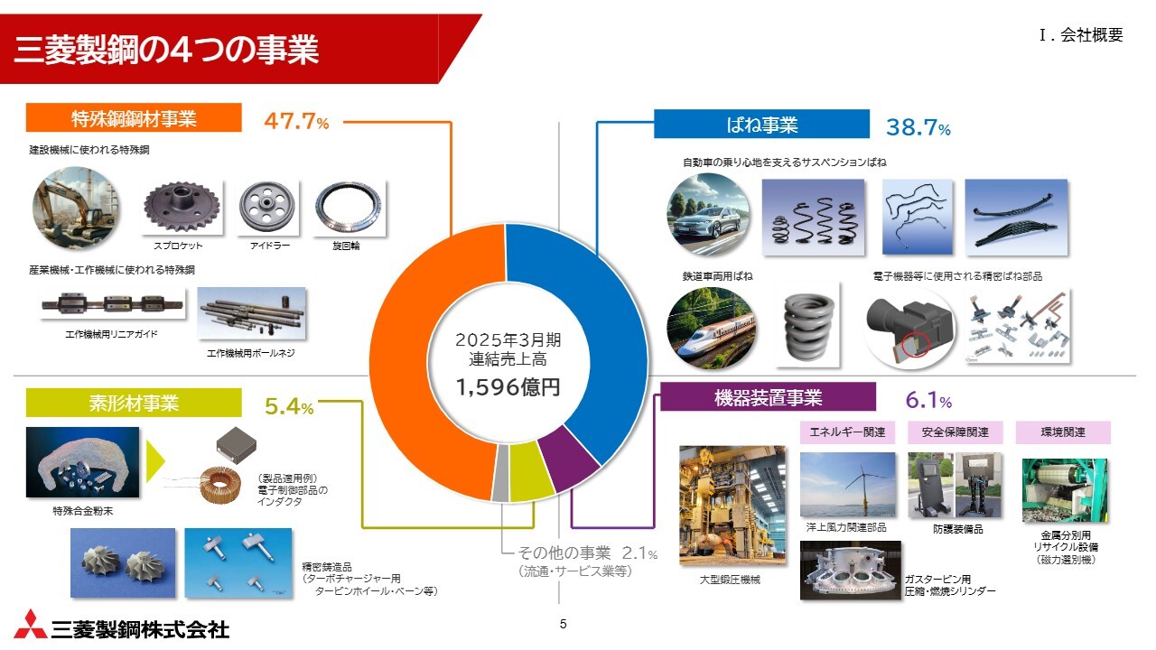 当社の事業は、「特殊鋼鋼材」「ばね」「素形材」「機器装置」の大きく4つに分類されています。スライド左上の特殊鋼鋼材事業は、売上高の約半分を占め、主に建設機械や工作機械向けが中心です。