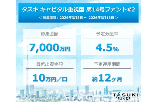 株式会社タスキホールディングス(本社:東京都港区、代表取締役社長:柏村 雄)のグループ会社である株式会社タスキ(本社:東京都港区、代表取締役社長:村田浩司、以下、タスキ)は、不動産投資型クラウドファンディングサービス「TASUKI FUNDS」において、2026年3月3日より「タスキ キャピタル重視型 第14号ファンド#2」の投資募集をいたしますので、お知らせします。
