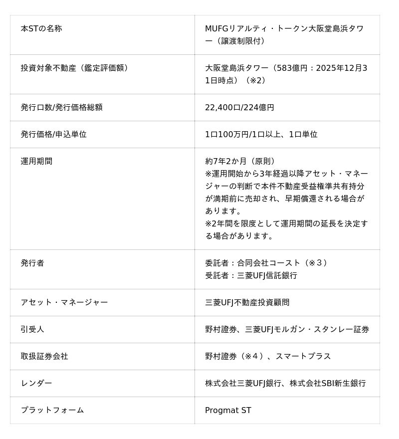 三菱UFJ信託銀行株式会社(取締役社長:窪田 博、以下「三菱UFJ信託銀行」)、三菱UFJ信託銀行の連結子会社である三菱UFJ不動産投資顧問株式会社(取締役社長:内田 直克、以下「三菱UFJ不動産投資顧問」)、野村證券株式会社(代表取締役社長:奥田 健太郎、以下「野村證券」)、三菱UFJモルガン・スタンレー証券株式会社(取締役社長:小林 真、以下「三菱UFJモルガン・スタンレー証券」)、株式会社スマートプラス(代表取締役: 小林 紀子、以下 「スマートプラス」)及びProgmat, Inc.(代表取締役: 齊藤 達哉、以下「Progmat社」)は、Progmat社が提供するデジタルアセット発行・管理基盤「Progmat ST(※1)」を活用した、不動産セキュリティ・トークン(以下「本ST」)の公募において協業し、このたび募集・発行を完了いたしました。