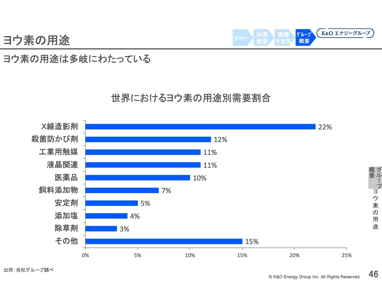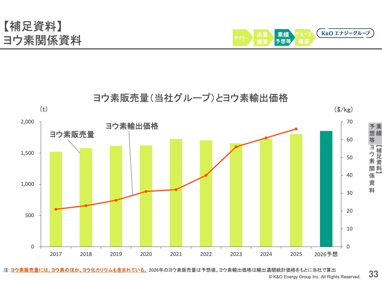 スライドのヨウ素の販売量は、当社グループの数字です。また、折れ線グラフで表したヨウ素の輸出価格については、当社グループの販売価格ではなく、輸出の通関統計価格をもとに当社が算出したドル建ての算定値です。当社グループの価格と同じ傾向を示しています。