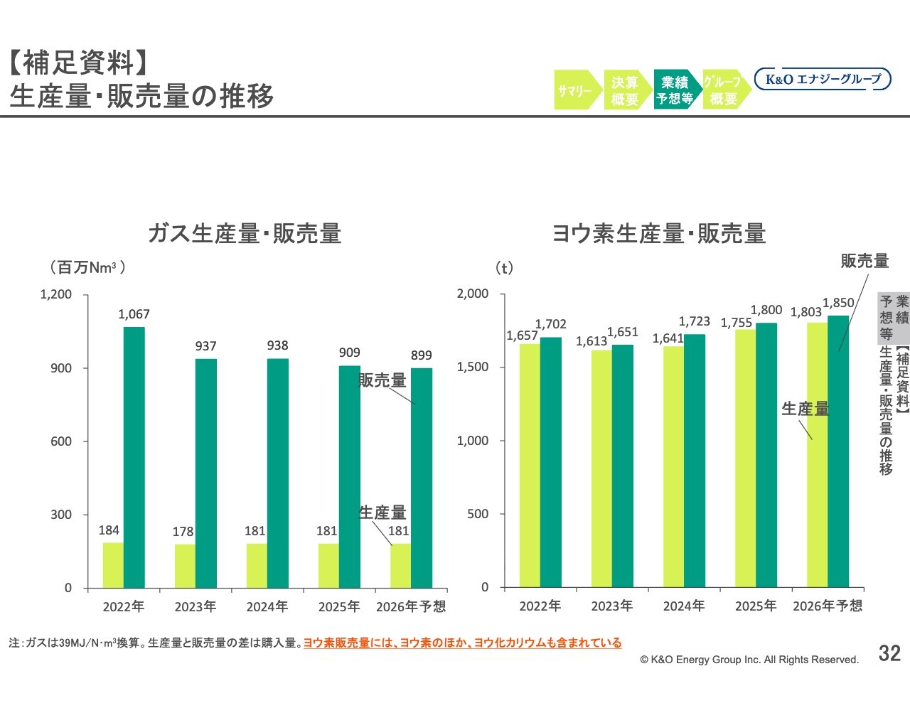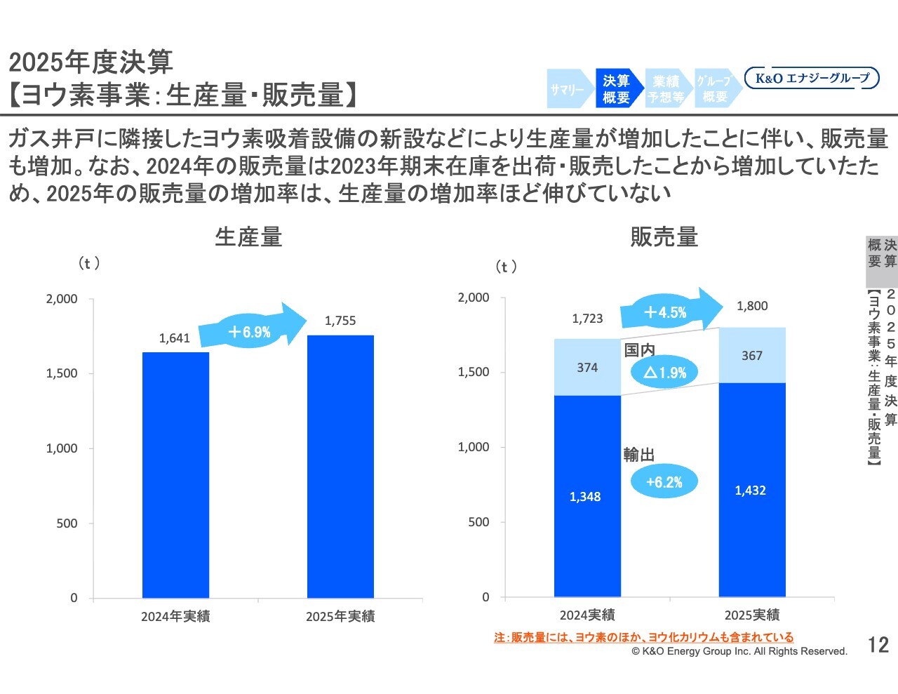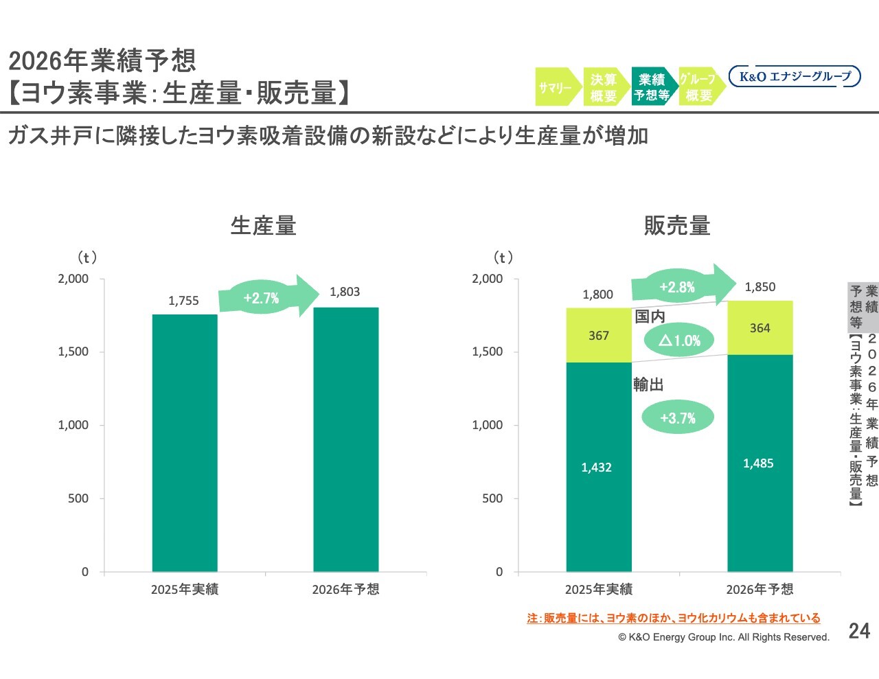 ヨウ素事業の販売量は、ヨウ素およびヨウ化カリウムを含む全体で前期比4.5パーセント増加の、1,800トンとなりました。生産量と販売量の増加の差については、2023年の期末在庫を2024年に出荷したことで2024年の販売量が通常より多くなっていたためです。この影響で、2025年の販売量は前期比ではそれほど大きな増加にはなっていません。