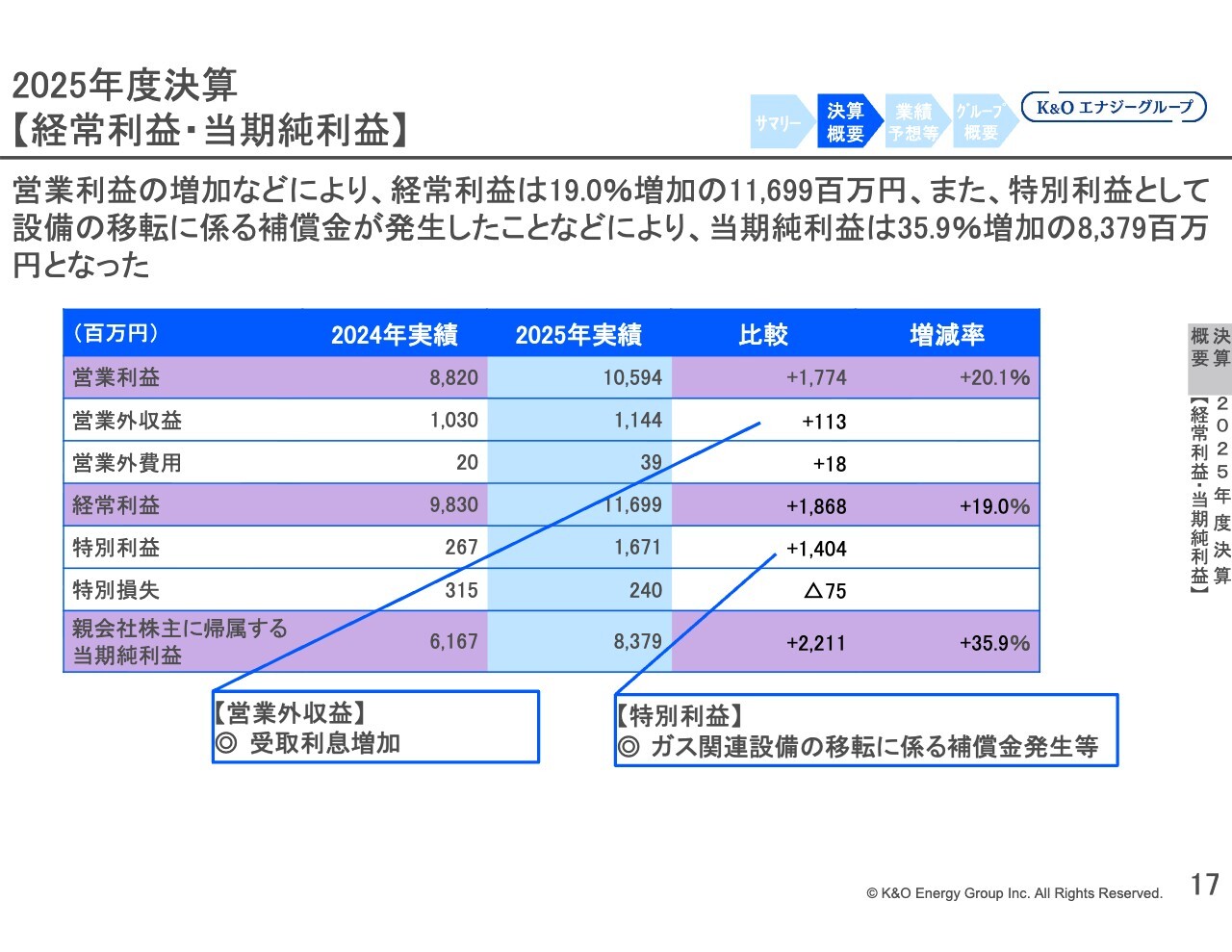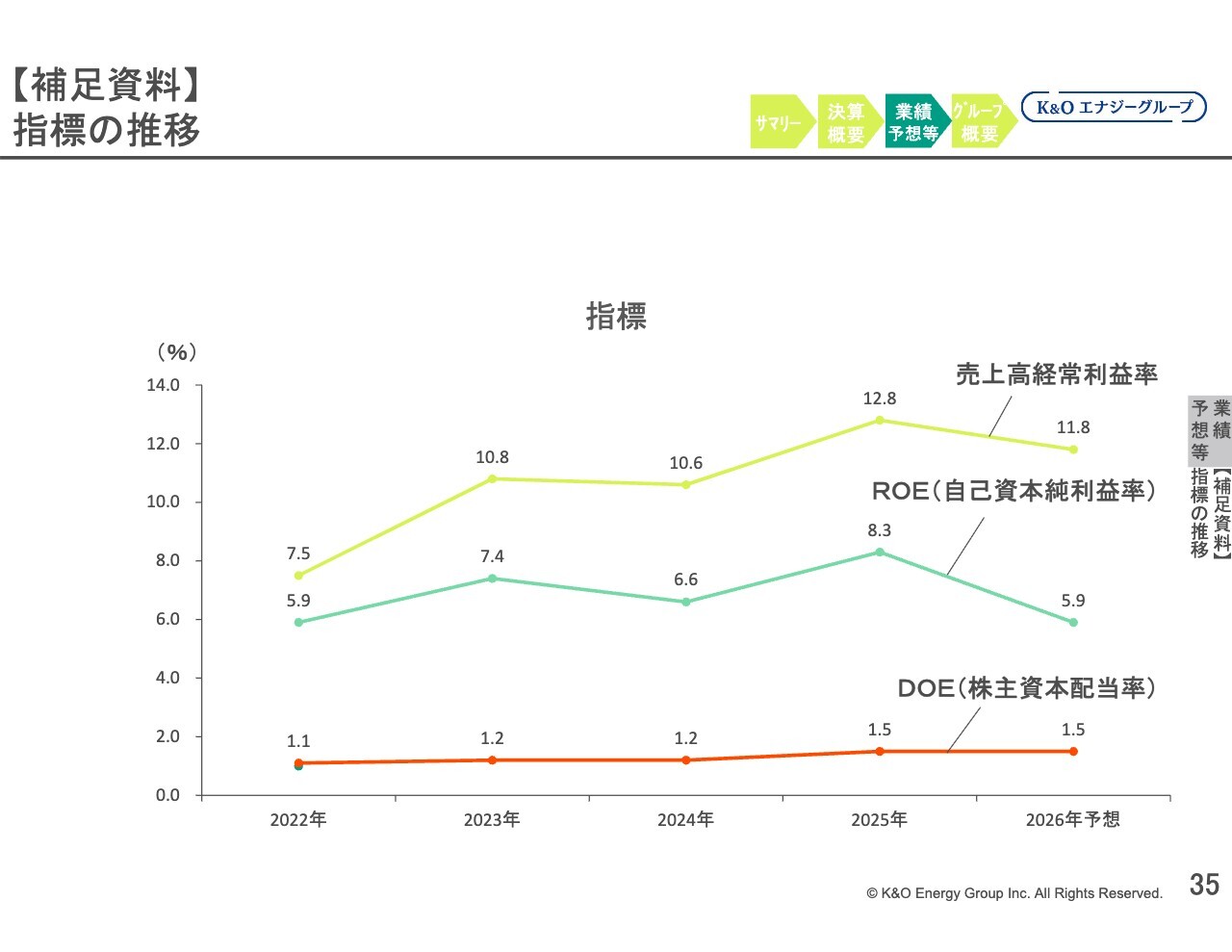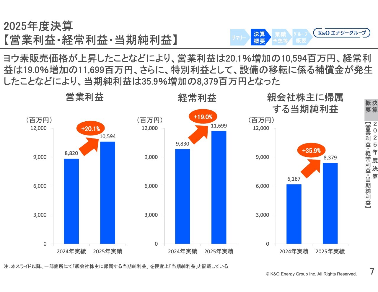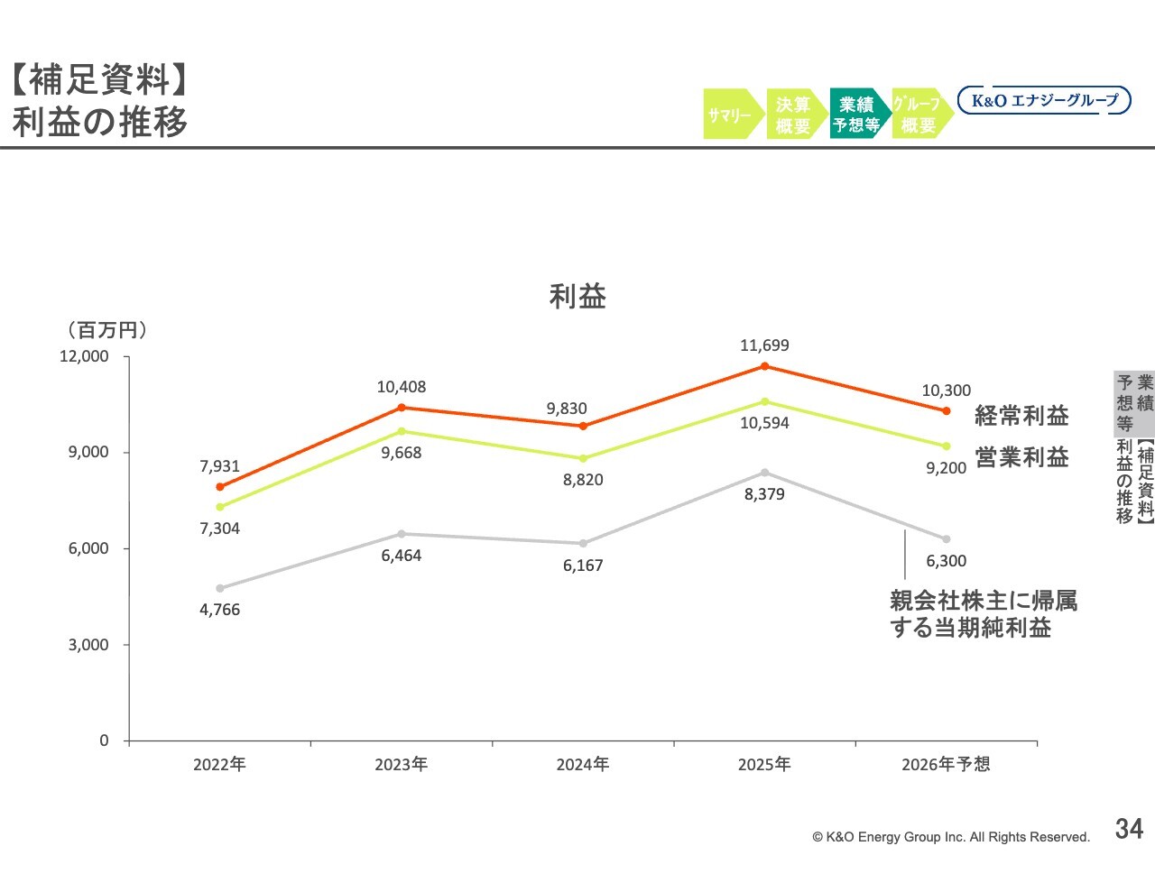 スライドのグラフは利益の推移を表しています。右から2番目の2025年では、各利益項目が大きく増加しています。このうち、経常利益と営業利益は、K&Oエナジーグループの設立以来、過去最高益を記録しました。