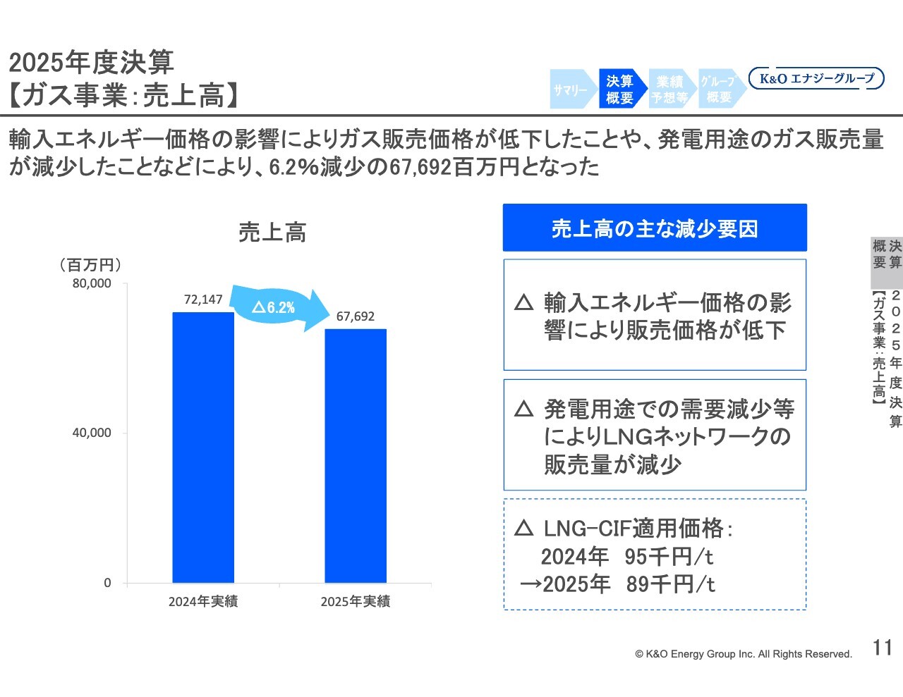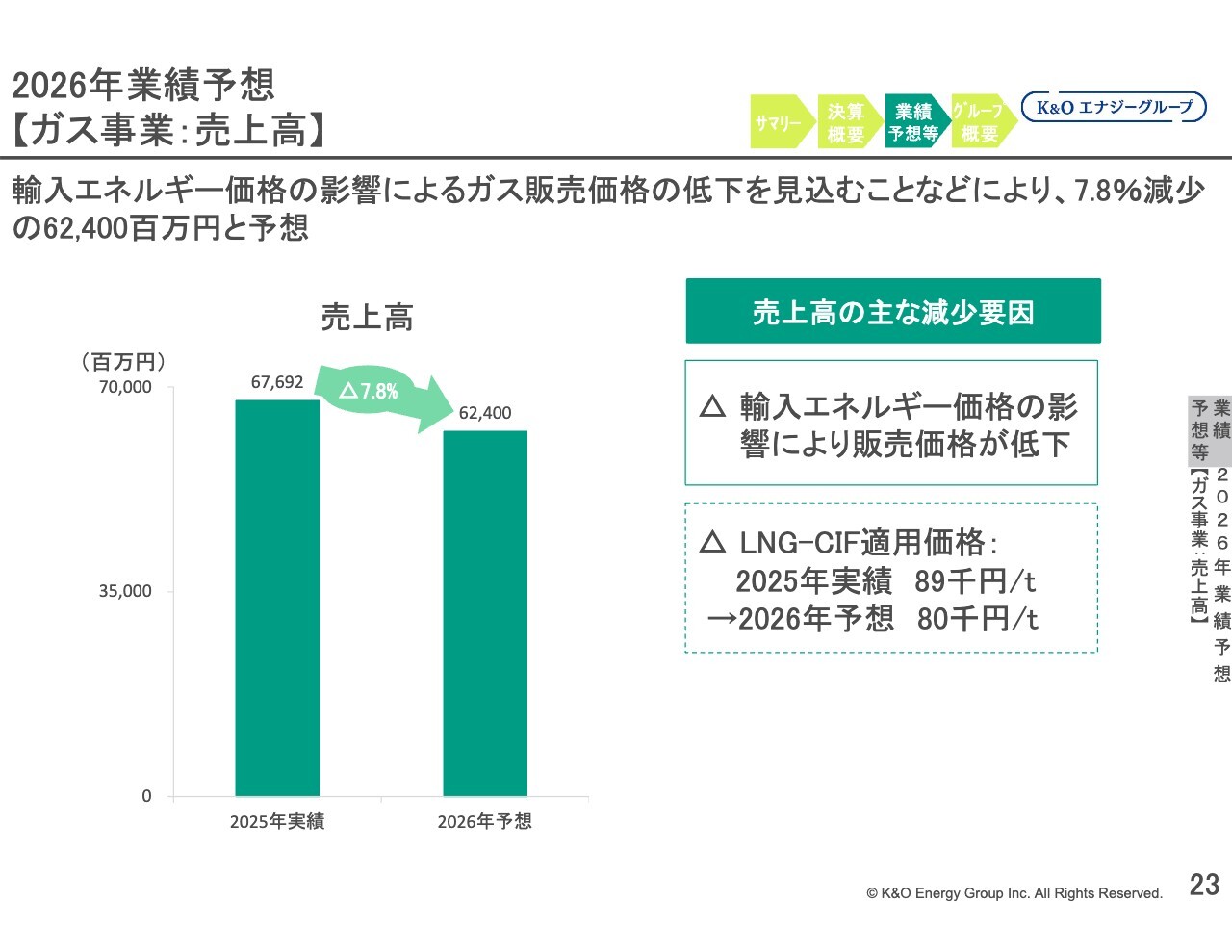 ガス事業の売上高の減少が主な要因となっています。その主な要因としては、2022年にLNG価格が大きく上昇した後、徐々に低下していることに伴う販売価格の低下により売上が減少したことが挙げられます。その結果、全体の売上高も減少傾向にあります。