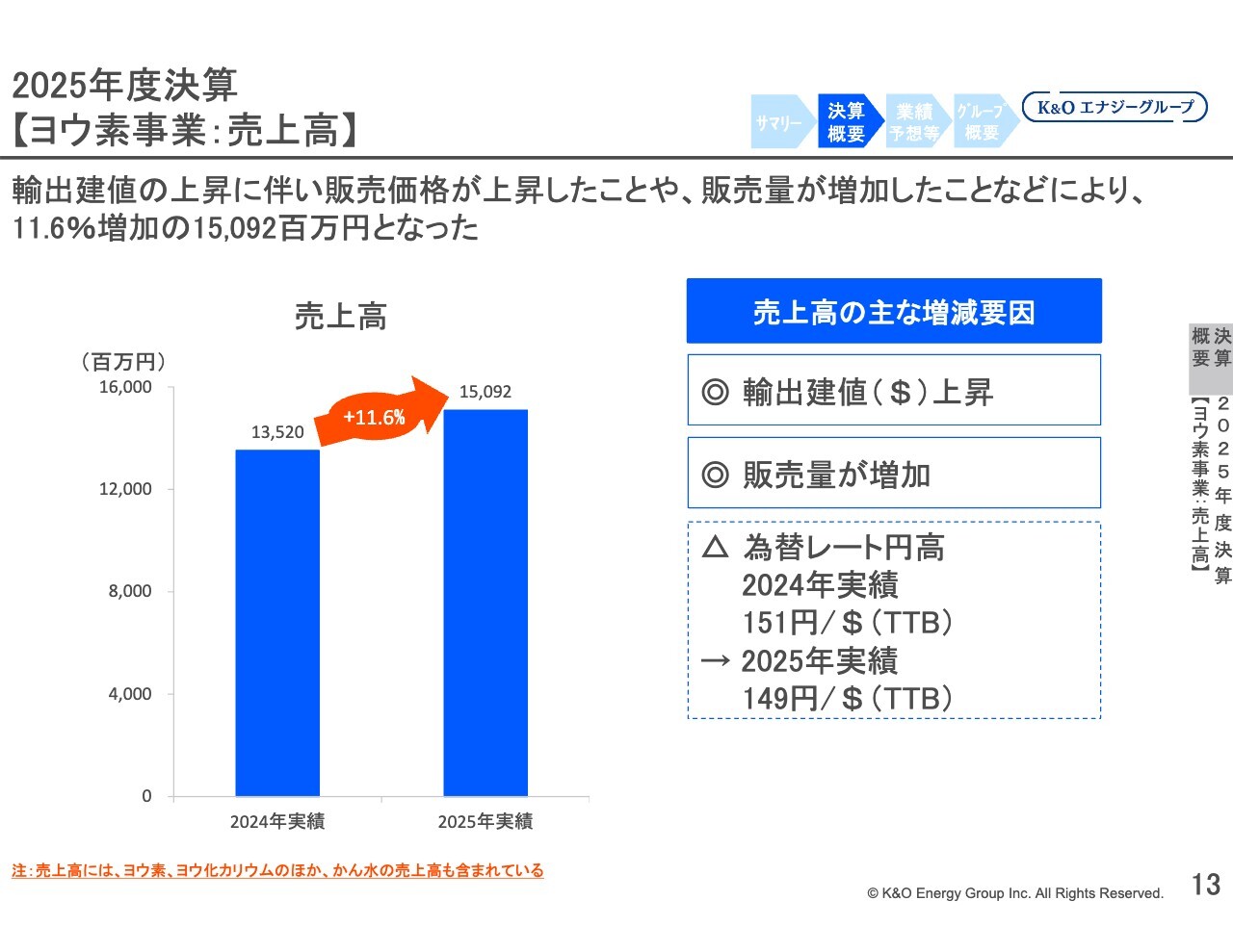 ヨウ素事業の売上高は、前期比11.6パーセント増加の150億9,200万円となりました。為替相場は前期と比較して円高で推移しましたが、輸出建値の上昇などにより円ベースの販売価格が上昇しました。さらに、前期より販売量が増加したこともあり、売上高が増加しています。