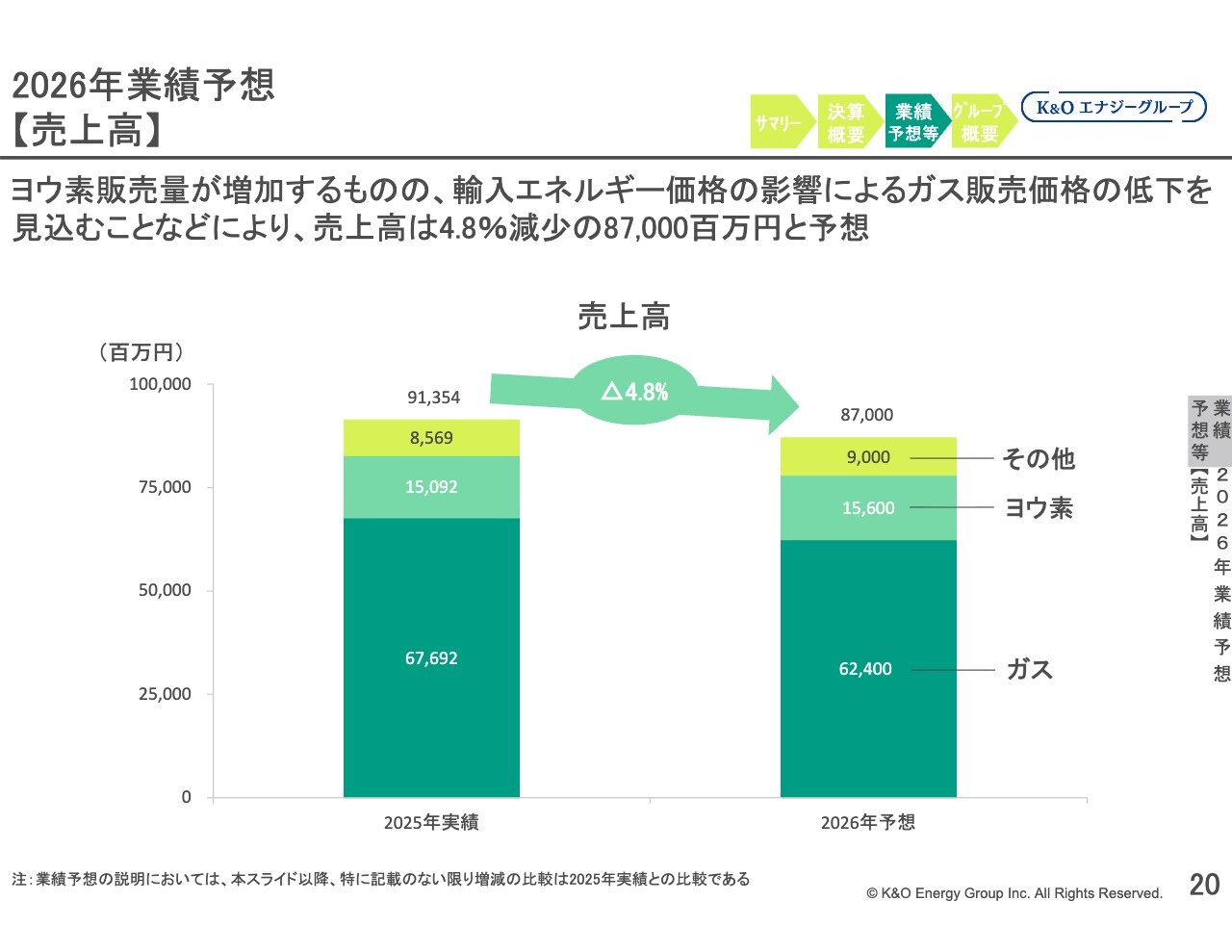 売上高の業績予想は、ヨウ素事業における販売量の増加が見込まれる一方で、輸入エネルギー価格の影響によりガス販売価格の低下を予想しており、売上高は全体で前期比4.8パーセント減少の870億円となる見通しです。