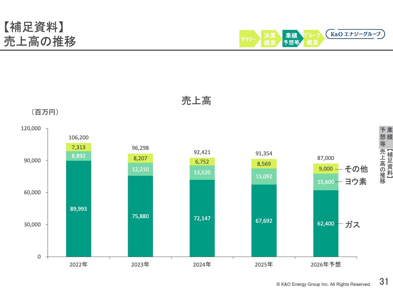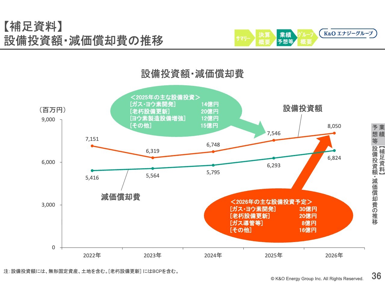 2026年については、ヨウ素製造設備への投資が減少する一方で、ガスおよびヨウ素の原材料であるかん水を生産する設備への投資が増加する計画です。スライド右下に「ガス・ヨウ素開発」という区分で記載していますが、この投資などにより、前期比で5億円増加の80億5,000万円となる見通しです。